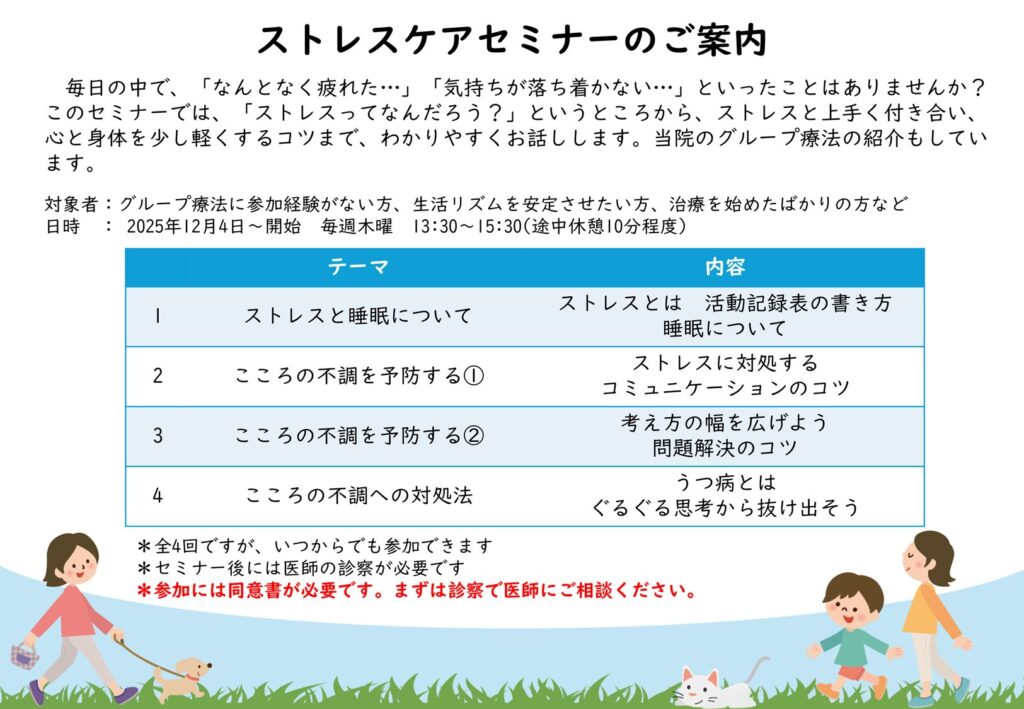 グループ療法に参加経験がない方、生活リズムを安定させたい方、当院で治療を始めたばかりの方などに、ご参加いただけるセミナーがスタートします。