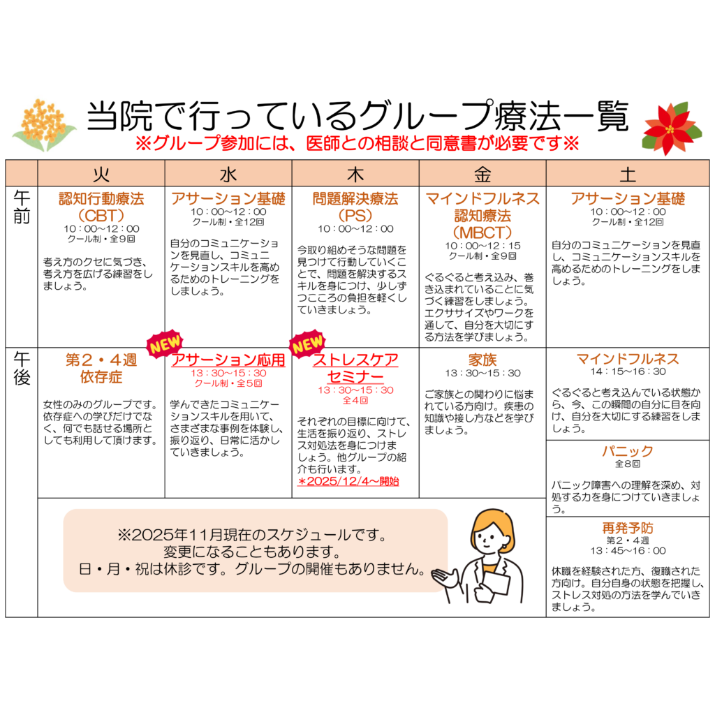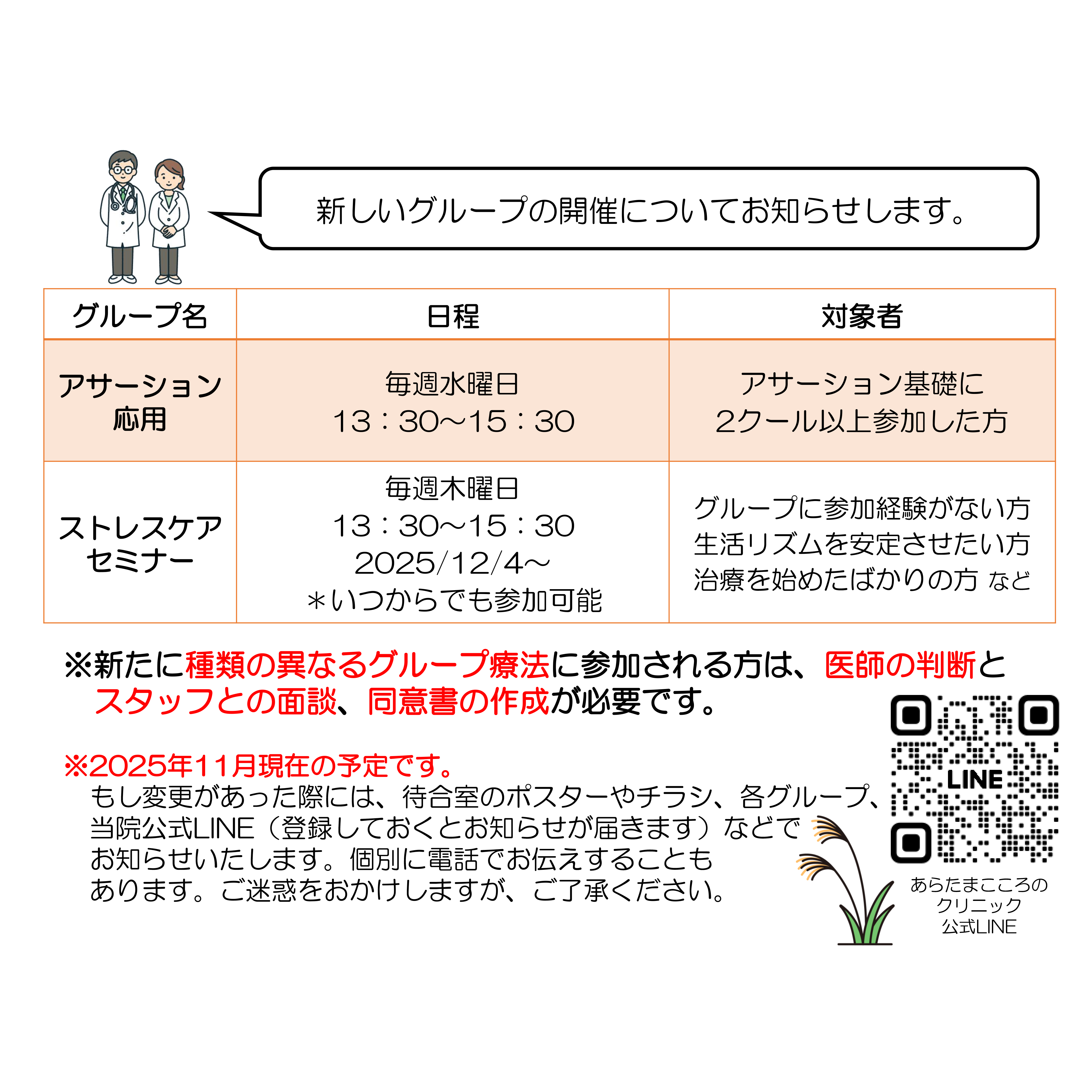 アサーション応用グループ、ストレスケアセミナー開催に伴い変更いたしました。