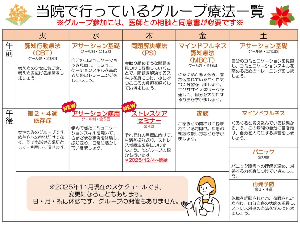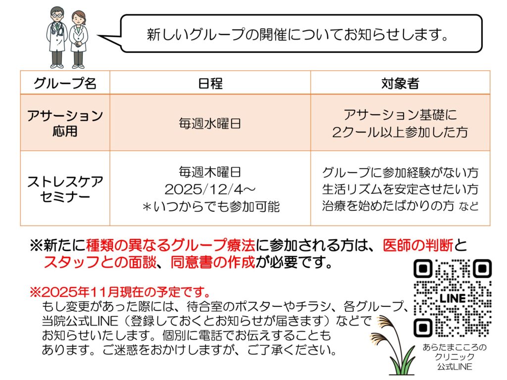 アサーション応用グループ、ストレスケアセミナー開催に伴い変更いたしました。