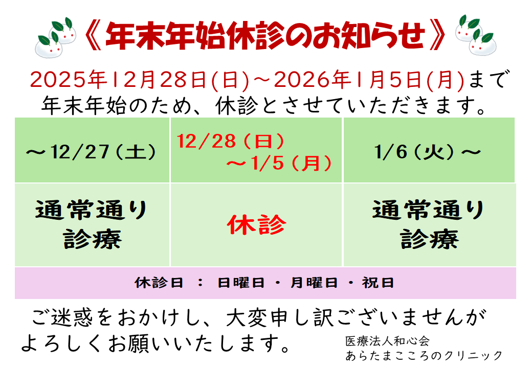 令和7年12月28日(日)~令和8年1月5日(月)まで、年末年始の為、休診とさせていただきます。