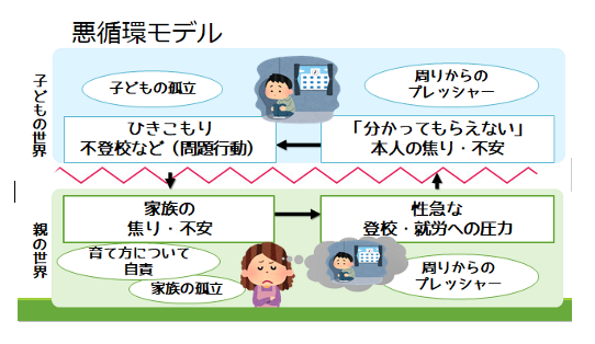 うつや不安が強くなると、自分のやってきたことに自信が持てなくなったり、自分を責めてしまったり、将来のことをあれこれ考えてしまうことが多くなります。ですから、ご家族に、引きこもりや不登校などの問題がある場合、自分の対応が悪かったんじゃないかと不安になり、自分を責め、ますます対応に自信が持てなくなってしまうことがあります。そして、子どもの問題がまるで自分の問題かのように感じ、問題が起こらないように先回りをして問題を防ごうと一生懸命になったり、家族の尻拭いをしたりしているうちに、家族の問題に巻き込まれてしまい、悪循環となってしまうのです。